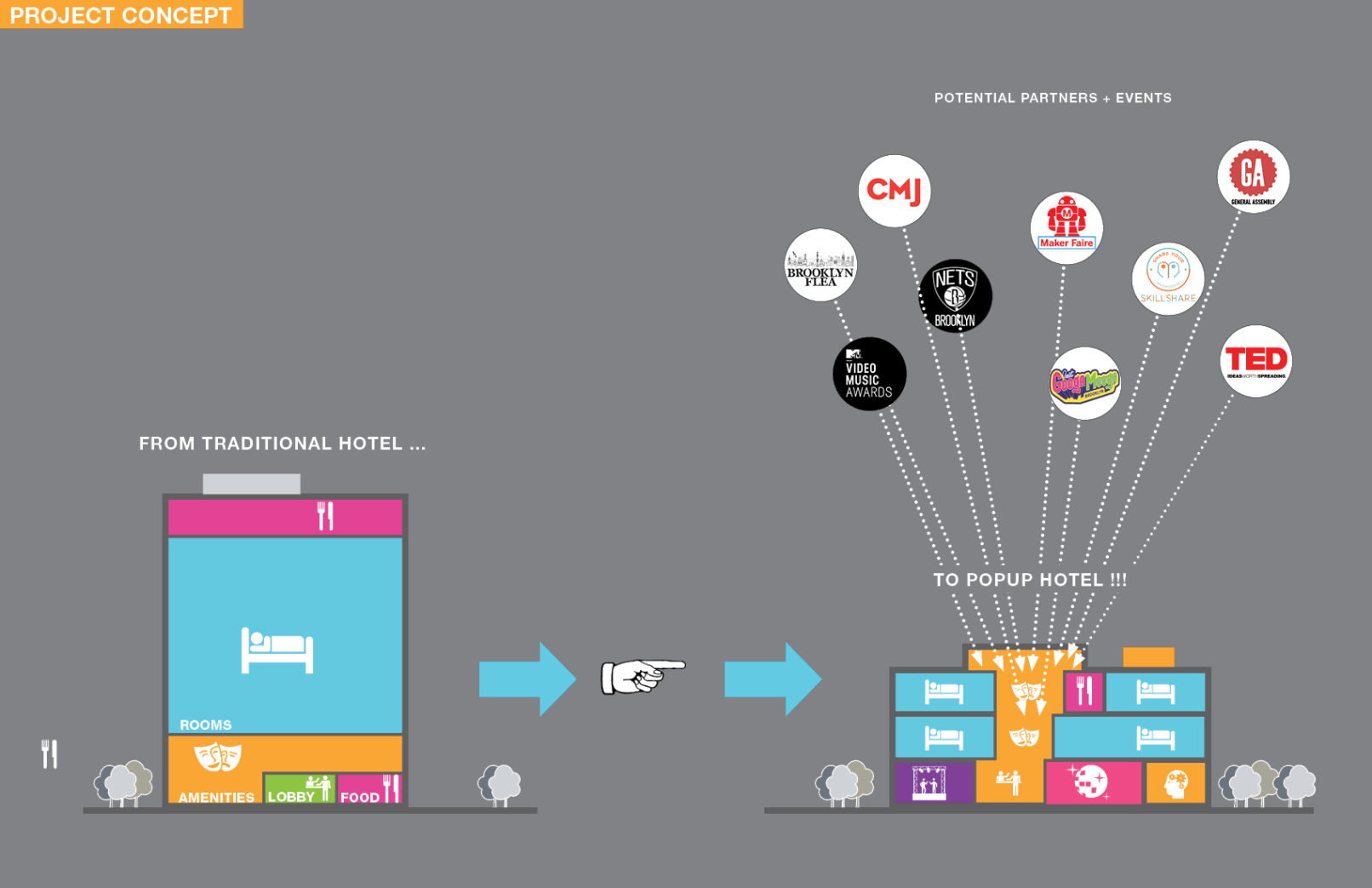 Located in Bushwick, Brooklyn, the PopUp Hotel is a 60 room, midscale, affordable luxury urban resort hotel, with uniquely social and cultural event programming, currently seeking financing, and based on two fundamental truths: